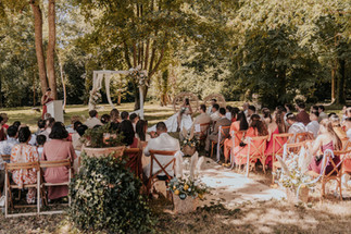 Lors de la cérémonie laïque, les chaises en bois, les compositions florales naturelles et les éléments décoratifs apportaient une touche à la fois élégante et authentique. La salle de réception mêlait quant à elle le charme de la pierre à une décoration chaleureuse, sublimée par une lumière douce et une mise en table raffinée, offrant un cadre convivial et accueillant.